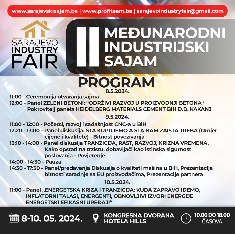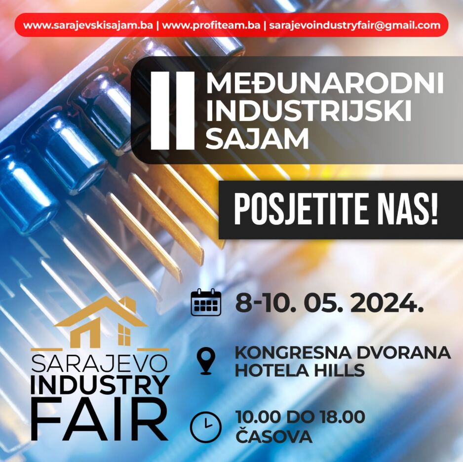 Drugo izdanje specijaliziranog privrednog događaja u Bosni i Hercegovini, jedinog sajamskog događaja koji okuplja isključivo kompanije koje djeluju u industriji pod nazivom Međunarodni industrijski sajam “SARAJEVO INDUSTRY FAIR – SIF 2024” održava se unutar kompleksa kongresne dvorane hotela HILLS u Sarajevu na Ilidži kao i na dijelu ispred dvorane te će cijeli sajamski prostor biti na preko 8000 m2 prostora.